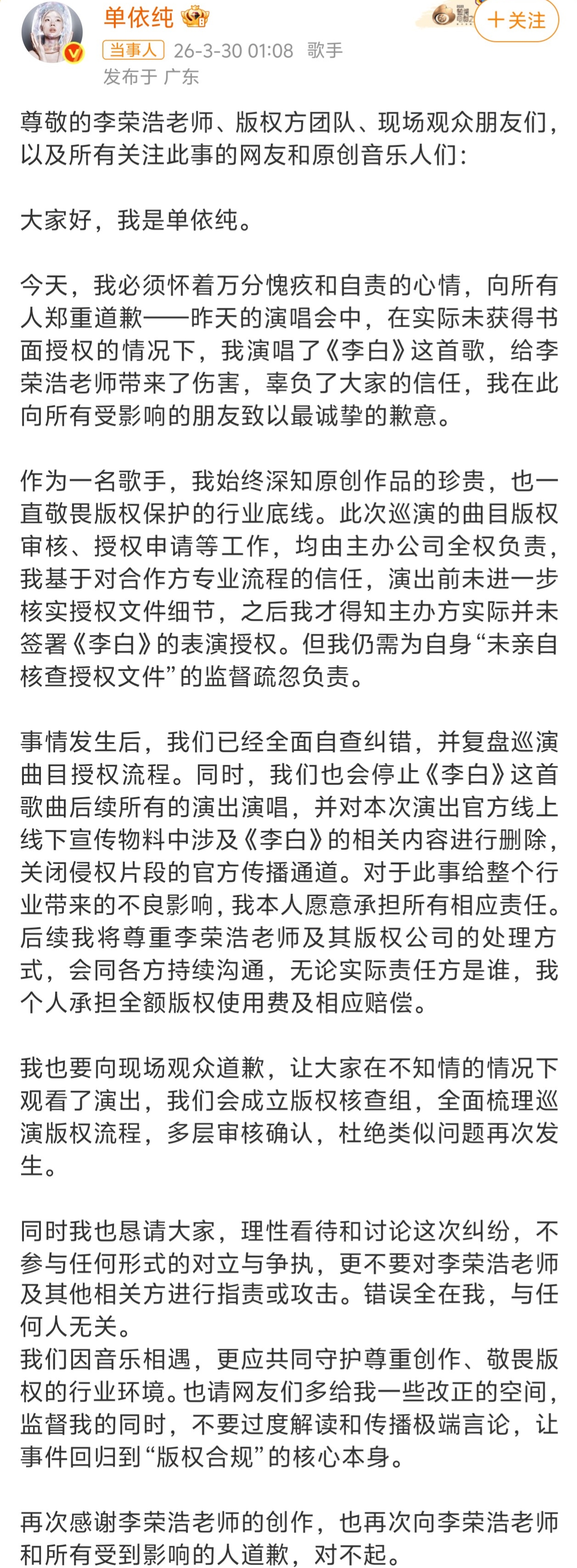3月30日凌晨,歌手单依纯发布长文,再次回应此前被李荣浩喊话侵权演唱《李白》一事,并公开道歉。她在文中表示,在未获得书面授权的情况下演唱了《李白》,对此深感歉意,并承诺将承担全部相应责任,包括全额版权使用费及赔偿。